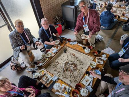 Barbara - "Lunch in Aso, sat on the floor and ate food cooked over charcoal - tofu, fish, some chewy root - they staggered the bus arrivals, but fed over 200 people."