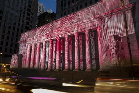 Part of the Let’s Glow SF light show is seen on the exterior of the Pacific Coast Stock Exchange building at 301 Pine St. in December 2023.